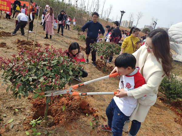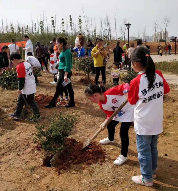 活動現場,家長和孩子一起拿著工具,從挖坑、扶苗、培土、踩實,每一道工序都做的很認真,尤其小朋友對于植樹的熱情非常高。孩子和家長之間配合默契,有條不紊,現場熱火朝天,效率非常高,一顆顆樹苗錯落有致,迎風挺立,為春天增添了濃濃的綠意。